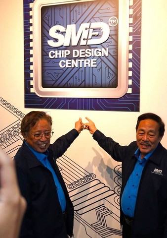 Premier Sarawak, YAB Datuk Patinggi Tan Sri (Dr.) Abang Haji Abdul Rahman Zohari bni Tun Datuk Abang Haji Openg (tengah) dan Menteri Pendidikan, Inovasi dan Pembangunan Bakat, YB Datuk Roland Sagah Wee Inn menunjukkan papan tanda Pusat Reka Bentuk Cip SMD selepas beliau merasmikan pusat tersebut dan juga Akademi SMD